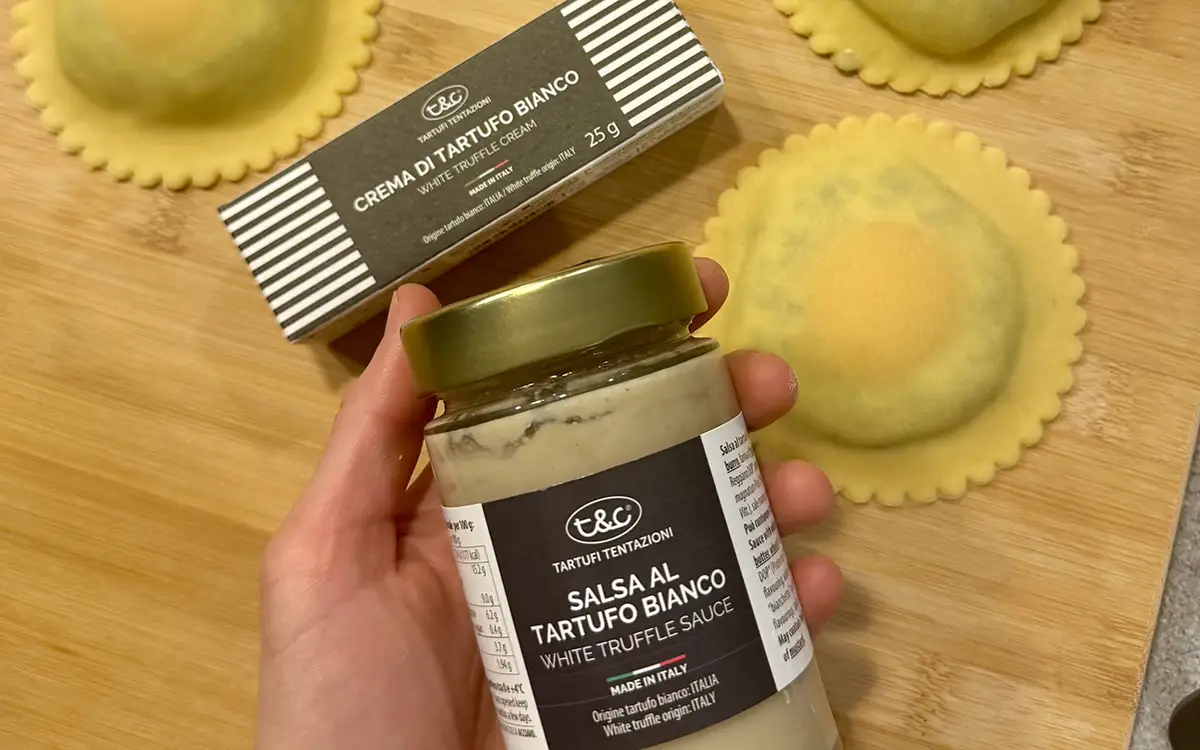 Heat the truffle butter in a double boiler until melted, then shake for a few seconds and place them in a pan. For even more flavor, add a little white truffle cream diluted in a little of the cooking water. Cook each ravioli for a few minutes in boiling salted water, then add them to the sauce, finishing with a sprinkling of Parmigiano Reggiano cheese, if desired.